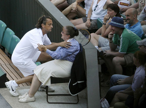 France's Henri Leconte (L) kisses a line judge during his
