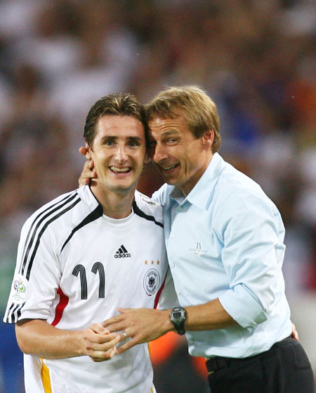 Germany's Miroslav Klose (L) and coach Juergen Klinsmann smile after Klose's