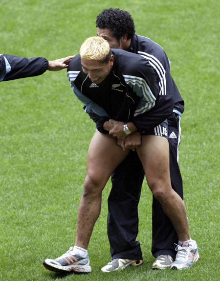 New Zealand player Jerry Collins is restrained by teammate Mils Muliaina at