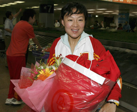 Chinese women's football team player Ren Liping arrives at Beijing International Airport on 1 August, 2006. Some women footballers, who just grab AFC Asian Cup title, return to Beijing by plane.[Xinhua]