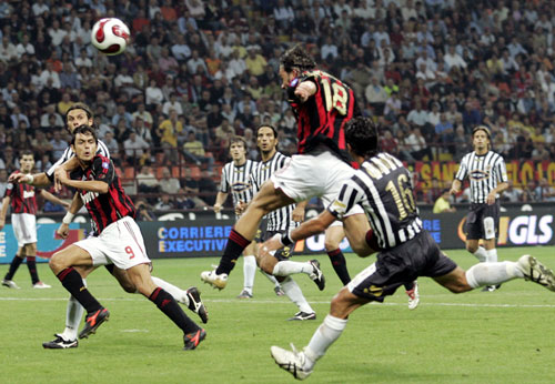 AC Milan's Marek Jankulovski (top) jumps and scores against