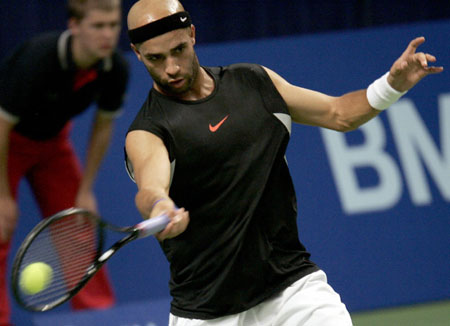 James Blake of the U.S. returns the ball to Jarkko Nieminen of Finland during