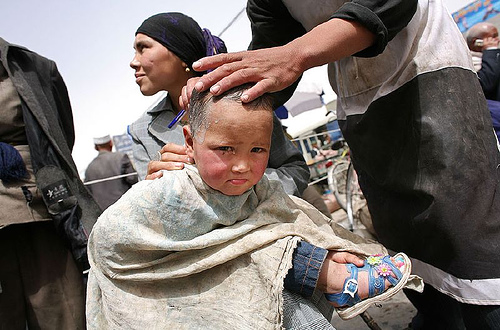 A boy starts to cry as he gets his head shaved in Hotan's market. [Photo by Natalie Behring]