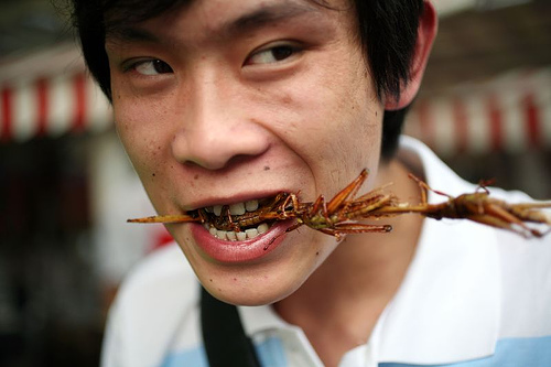 A tourist from Shangdong, Mr. Wang savors a crunchy grasshopper kebab in Beijing's DongHuamen Night Market June 21, 2006. Late-night dining is a favorite Beijing pastime, and the most convenient way to experience it is to visit one of several night markets scattered about the city. The markets are typically made up of stalls, jammed side by side, selling all manner of snacks. Most legendary are the little animals on sticks, a veritable zoo of skewers that includes baby birds and scorpions. [Photo by Natalie Behring]