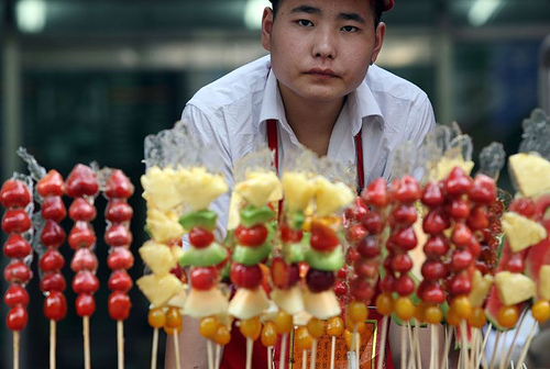 A candies fruit vendoe waits for customers in Beijing's Dong Huamen Night Market June 21, 2006. [Photo by Natalie Behring] |