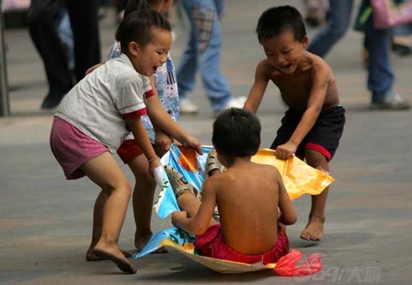 These photos show some children forcefully begging for money from pedestrians in the Pearl River Delta. The young beggars are mostly children of poor migrant workers. At times they even assault pedestrians.