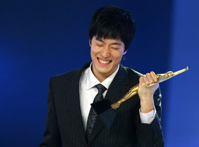 Liu Xiang holds a trophy to celebrate after he is named Sportsman of the Year