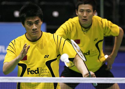 China's Fu Haifeng (L) plays a shot as his playing partner Cai Yun looks on during their doubles badminton match against Malaysia at the Sudirman Cup World Team Badminton Championships in Glasgow, Scotland June 14,2007. [Reuters]