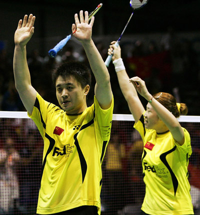 China's Zheng Bo (L) and partner Gao Ling celebrate victory after their mixed