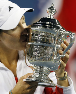 Updated: 2007-09-09 22:03 ![]() Justine Henin of Belgium kisses the trophy after defeating Svetlana Kuznetsova of Russia in the women's final of the US Open tennis tournament in Flushing Meadows, New York, September 8, 2007. [Reuters] |