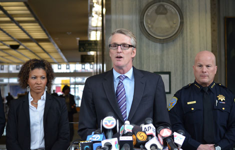 Ed Murray (L) is sworn in as Mayor of Seattle by Gary Locke (C) as Murray's husband Michael Shiosaki (R) watches at City Hall in Seattle, Washington Jan 6, 2014. Murray is the first ever openly gay mayor to be elected to office in Seattle. [Photo/Agencies]