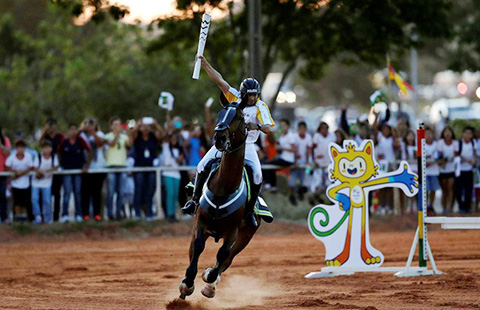Olympic flame torchbearer, Chinese actor Yang Yang, center, runs with the flame during the torch relay of the Rio Olympic Games on Rio-Antirrio Bridge of Greece, on April 22, 2016. [Photo/VCG]