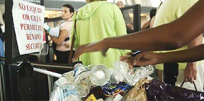 弗吉尼亞杜勒斯機場安檢處附近一個裝滿了礦泉水瓶和其它液體瓶子的垃圾箱,所有液態(tài)和膠狀的物體都不能帶上飛機,因為恐怖分子有用膠質和液體炸藥進行襲擊的可能。照片來源:美聯社Kevin