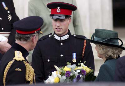 閱兵式后,查爾斯王子夫婦拿著鮮花對威廉表示祝賀。