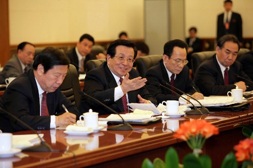 3月6日,中共中央政治局常委、全國政協主席賈慶林參加全國政協十屆四次會議港澳委員聯組討論。新華社記者楊俊江攝