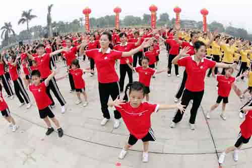 6月29日,家長們和孩子們一起做親子體操。當日,500名兒童和500名家長一起在南寧市南湖水幕電影廣場一起做親子體操,表達迎接奧運的喜悅心情。 新華社記者周華攝