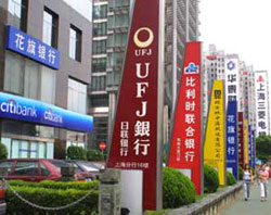 Pedestrians walk past billboards of foreign banks in a street in Shanghai in this October 15, 2004 file photo. China's banking regulator says nine Chinese banks introduced foreign strategic investors and another nine are in negotiation with potential foreign buyers. [newsphoto]