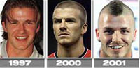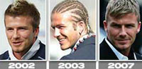 貝克漢姆的發(fā)型一向是時(shí)尚的風(fēng)向標(biāo),從1997年的清純中分,到2002世界杯的莫西干,再到2003年的麻花辮,貝克漢姆多邊的發(fā)型不知換來多少女球迷的尖叫……不過近段,小貝卻在“頭上”屢栽跟頭,前不久的“馬桶蓋”發(fā)型被人認(rèn)為“土的掉渣”,這次染的亮金色不知會(huì)不會(huì)再起反作用。貝克漢姆的新發(fā)型可以說是他在皇馬的最后一次變形了。
