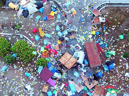 | 數(shù)百名畢業(yè)生“狂歡”過后的校園,滿地都是從高處拋下的雜物和桌椅