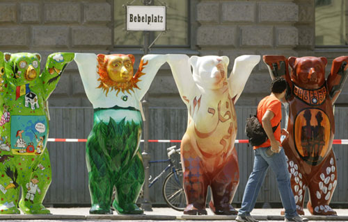 A man walks past four Buddy Bear sculptures at the Bebelplatz square in Berlin June 14, 2006. (Reuters)