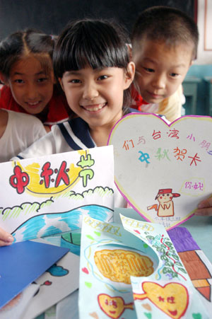 A student from Taiwan shows the hand-made Mid-autumn Festival cards she received from her Mainland China students in Jinan, Shandong Province, September 24, 2007. This year's Mid-autumn Festival falls on September 25. (Xinhua)