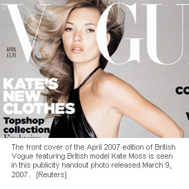 The front cover of the April 2007 edition of British Vogue featuring British model Kate Moss is seen in this publicity handout photo released March 9, 2007.