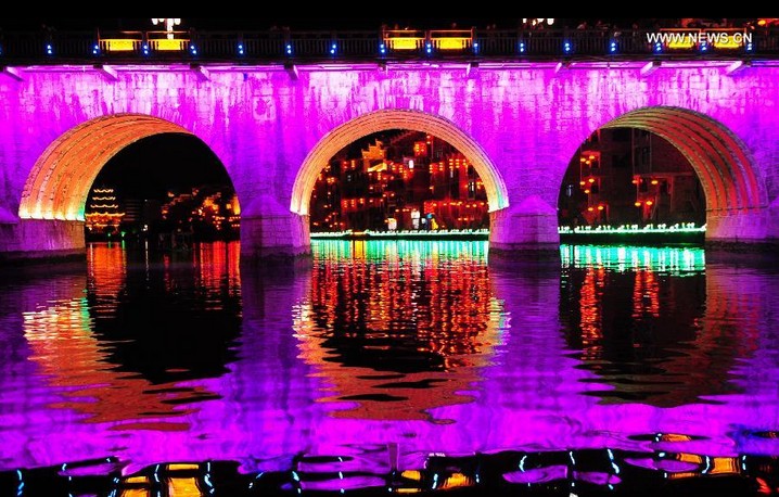 Photo taken on Aug. 5, 2013 shows a night scenery of Zhenyuan Ancient Town in southwest China's Guizhou Province. Known as "Oriental Venice", Zhenyuan Ancient Town witnessed a tourism peak this summer. (Xinhua/Liu Xu)