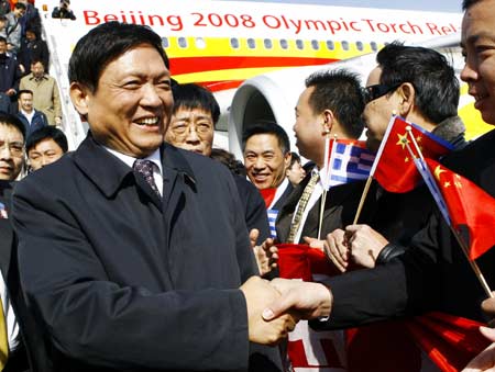 Liu Qi (front L), president of the Beijing Organizing Committee for the Games of the XXIX Olympiad (BOCOG), also the Communist Party of China chief of Beijing, arrives in Athens of Greece on March 29, 2008. [Xinhua]