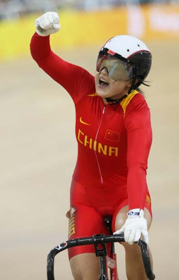Track cyclist Guo Shuang of China celebrates after defeating Australia's Anna Merares in the 2008 Beijing Olympic Games women's sprint semifinals at the Laoshan Velodrome in Beijing on August 19, 2008. [Agencies]