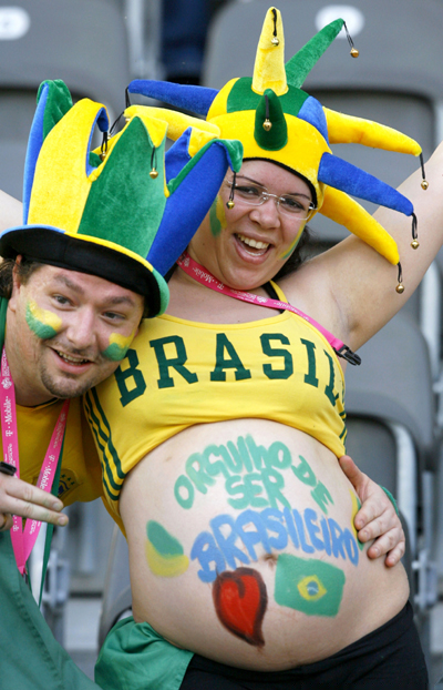 Brazil fans pose inside the stadium before the Group F World Cup 2006 soccer match between Brazil and Croatia in Berlin June 13, 2006. The words read "Proud to be Brazilian". [Reuters]