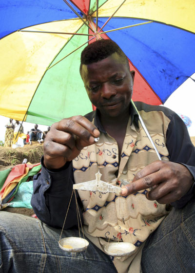 A man weighs gold nuggets at Pkata gold mine near Bunia in eastern Democratic Rpublic of Congo October 30, 2006. Picture taken October 30, 2006. [Reuters]