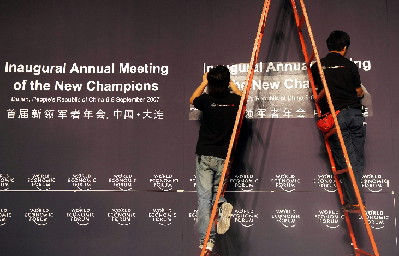 | Workers prepare for the meetings in the Plenary Hall in the Dalian World Expo Center in Dalian, a coastal city in Northeast China's Liaoning Province, September 4, 2007. The Inaugural Annual Meeting of the New Champions organized by the World Economic Forum is going to be held here on September 6-8. [Xinhua] |
