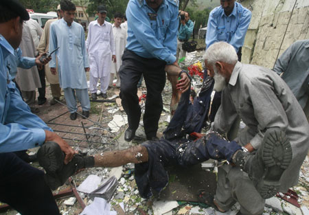 The blast will raise fresh questions about the safety of foreigners in Pakistan even though militant attacks have dropped off since a new government came to power after a February general election vowing to negotiate to end violence. Danish newspapers infuriated Muslims around the world when they published cartoons of the Prophet Mohammad in late 2005. The cartoons, considered blasphemous by Muslims, sparked deadly protests in 2006 which included attacks on Danish missions. The embassy in Islamabad was temporarily shut in 2006 after violent protests over the cartoons. Residents of the neighbourhood said they had feared an attack on the mission. "Since the printing of cartoons, we always had this fear," said Sana Khalid, a resident of the area. "But what they did to our religion, they deserve it." The blast destroyed the embassy gate and damaged the front of the building and vehicles in the compound in the upmarket district of Islamabad where other missions and diplomats' houses are located. Police and security officials said all of the dead and wounded were Pakistanis and the bomb was suspected to have been set off by a suicide bomber in a car. The blast left a crater about three feet (one metre) deep on the road outside the mission. A car engine was left about 30 feet (10 metres) from the crater. Television pictures showed considerable damage to nearby buildings and vehicles. One of the dead appeared to be a Pakistani guard. Two of the dead were policemen, police said. "It's dangerous" Danish Foreign Minister Per Stig Moller condemned the attack. "It's terrible that terrorists commit such acts," he said in an interview on Danish television station TV2 News. Moller said he did not know if any Danes were hurt. "We already were working under a higher security level in Pakistan ... It's dangerous. There are fanatics and terrorists out there," he said. |