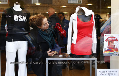 A shopper looks at items donated by David and Victoria Beckham at a Red Cross charity shop in Chelsea, central London, November 22, 2013. The Beckhams donated shoes and clothing to the Red Cross charity shop to help its efforts to raise money for the victims of the typhoon Haiyan which devastated parts of the Philippines. [Photo/Agencies]