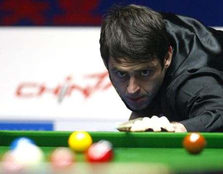 Ronnie O'Sullivan plays a shot against Hong Kong's Marco Fu during the first round match at China Open in Beijing on March 26, 2008. O'Sullivan lost 5-4. [Xinhua]