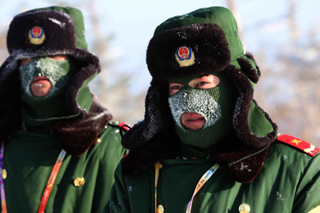 Paramilitary policemen stand guard in the Yabuli ski resort, Northeast China's Heilongjiang Province, February 17, 2009. Snow sports of the 24th World Winter Universiade are held at Yabuli Ski Resort. [Xinhua]