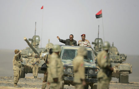 Yemen's President Ali Abdullah Saleh waves during an inspection after a military manoeuvre in Marib province February 3, 2009. [Agencies]