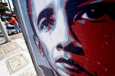 A campign poster of Barack Obama in Los Angeles. The artist who created the iconic pop-art portrait which became the unofficial logo for Obama's insurgent White House bid, has been arrested in Boston for defacing property with graffiti, US media reported. [Agencies]