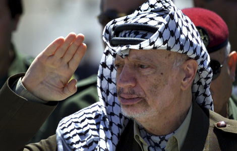 Palestinian President Yasser Arafat reviews an honour guard on his arrival at the Gaza Strip May 5, 2001. [Photo/Agencies] |