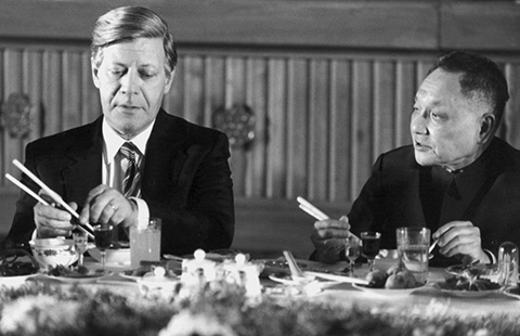 Then Chinese Vice-Premier Deng Xiaoping instructs then German Chancellor Helmut Schmidt in the use of chopsticks during a banquet in Beijing, in the Oct 29, 1975 file photo. Schmidt, who led the country for eight years at the height of the Cold War, has died at the age of 96, his office said on November 10, 2015. [Photo/IC]